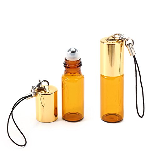 Furnido 10 Pcs 5ml Portable Amber Glass Roll On Bottles With Pendant Empty Essential Oils Liquid Perfume Roller Glass Bottles Container Metal Rollerball Bottles Vials