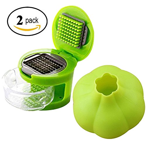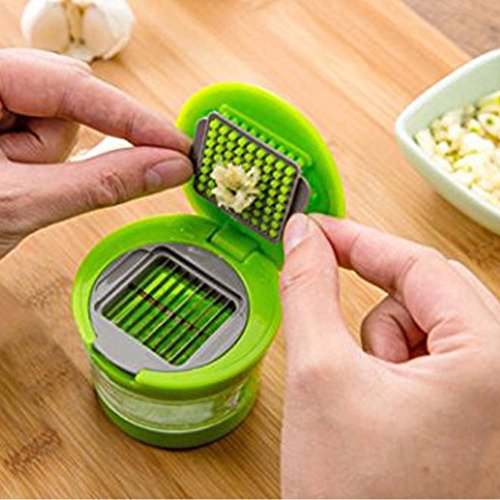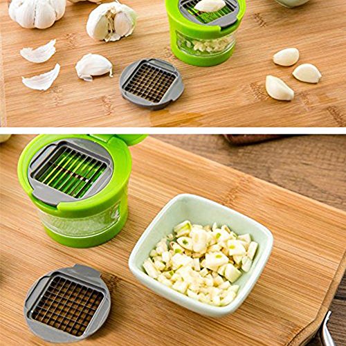 --GARLIC CUTTER: Size: 3"WX2.4"H 1. Choose what size you want to cut the garlic; 2. Simply place the peeled clove on the blade; 3. Press/push down the lid to chop the garlic; 4. All the minced garlic are conveniently stored in removable clear container, Bottom of which is indented to act as a micro grater for soft foods;
