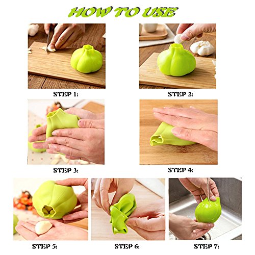 --GARLIC PEELER: Size: 3.2"WX3"H 1. Remove both tips of garlic. 2. Simply place a clove of garlic into the silicone garlic peeler, 3. 4.Roll peeler back and forth firmly between hands or on countertop. 5. Tip out peeled garlic cloves. 6.7. Turn peeler inside/out, wash with warm water or in the top rack of dishwasher.