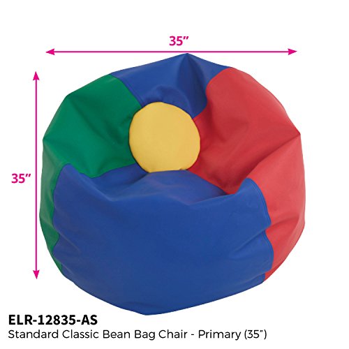 Studio : ECR4Kids Publisher : ECR4Kids Binding : Misc. Product Description The 35” Classic Bean Bag from ECR4Kids is a fun and comfortable place for children to curl up and read a book. Perfect in a classroom, daycare or home environment, the sturdy vinyl bean bag features double-stitched seams for durability and two locking-zippers to keep beads safely inside. The standard size has a 35" diameter and is recommended for use by children ages 2 and up. The ECR4Kids Classic Bean Bags are available in four attractive colors: assorted, blue, green, and red. With a concentration on the Pre K-12 sector, ECR4Kids offers a wide range of products from tables, chairs and desks to cots, mats and a variety of storage cases in solid wood as well as scratch resistant double-sided laminate. 0