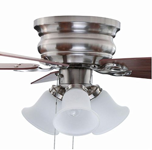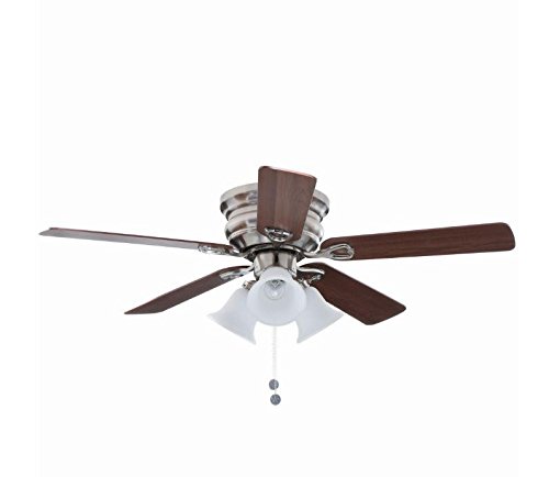 For comfort and attractive looks, the Clarkston 44 in. Brushed Nickel Ceiling Fan is a superb choice for smaller rooms. It comes with a three-light kit and reversible blades that allow you to easily change the look. It's suitable for a number of home decorating styles. 5 reversible blades allow you to choose a maple or walnut finish. Brushed nickel housing blends with a variety of decor styles. Integrated light kit with frosted white glass. Up to 3241 CFM airflow. 13.50 in. drop from top of fan to bottom of fan for close ceiling mounting applications. Easy-install mounting system for simple flush-mount installation.Feature