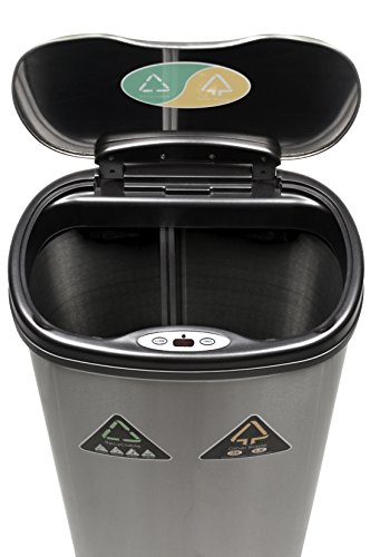 - Feature : Seals odor in and eliminates cross-contamination of germs with touch-free operation / Energy saving technology keeps battery life 20-percent longer / World's 1st hands-free recycle unit, one side for trash/one side for recyclables / Features a garbage bag ring to keeps the bag hidden from public view for a neat and clean appearance / Measures 11.5-inch D by 16.5-inch W by 26.5-inch H; 10.7 Pounds; 1-year warranty