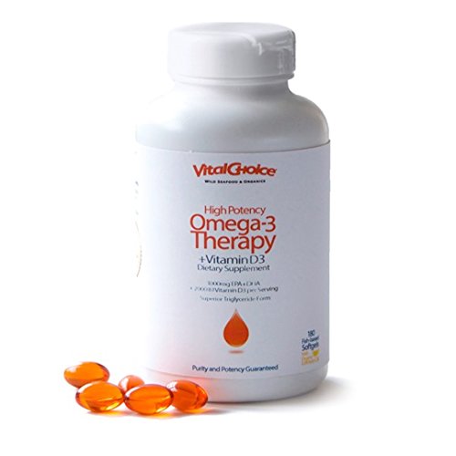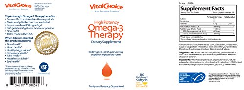 Vital Choice Hi-Potency Omega-3 Therapy supplements provide concentrated amounts of omega-3 fatty acids. Each two-softgel serving provides 1,010mg of omega-3 EPA+DHA.