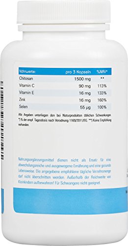 -. Feature : Mit Vitamin C und E sowie den Spurenelementen Selen und Zink! / Vitamin C trägt zu einem normalen Energiestoffwechsel bei! / 1500 mg Marken-Chitosan pro Tagesdosis! / Hergestellt in Deutschland - kontrollierte Qualität!
