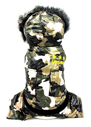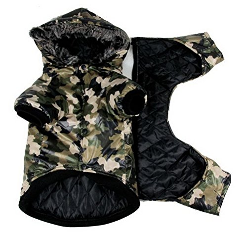 -. Feature : Available for small size pet, such Cat, Chihnuahua, Poodle, Cup Poodle, Pomeranian, Yourkshire Terrier, Bichon Frise, Cocker Spaniel. / This clothes runs small a little.Only for small dogs under 20lbs.Please take a measurement of your dog or cat before purchasing !!! / Classical and fashionable hooded four legged camo waterproof trench coat outfit / Soft fabric material keep little pet comfortable and warm during the cold winter / In the classic camouflage color pattern, plus fur trim