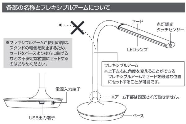 | 角度調節自在のフレキシブルアームを採用したLEDデスクライトです。タッチセンサーで調光出来る3段階調光機能付き。USB端子付きでスマートフォン充電もできます。光源には昼白色の高輝度LED28灯を使用しています。 |