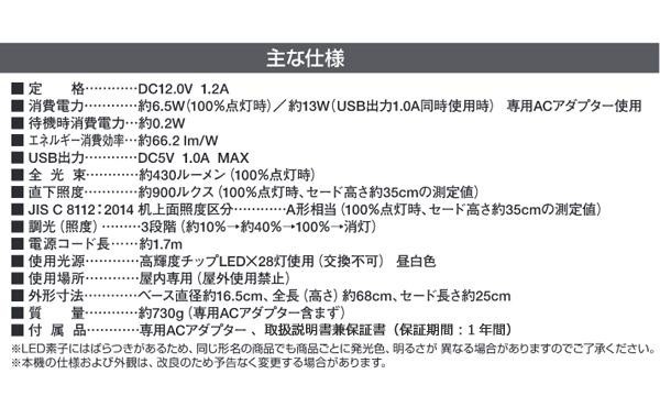角度調節自在のフレキシブルアームを採用したLEDデスクライトです。タッチセンサーで調光出来る3段階調光機能付き。USB端子付きでスマートフォン充電もできます。光源には昼白色の高輝度LED28灯を使用しています。 |