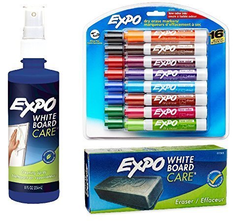 Expo 2 Low-Odor Dry Erase Markers, Chisel Tip, 16-Pack, Assorted Colors (81045) with Expo Whiteboard / Dry Erase Board Liquid Cleaner, 8-ounce and Expo Whiteboard Eraser, 5 1/8-inch
