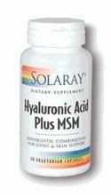 Studio : Solaray Publisher : Solaray Binding : Health and Beauty Product Description Description:Solaray combines two popular compounds for joint and skin health, Hyaluronic Acid and MSM. The Hyaluronic Acid used in this formula comes from microbial fermentation and Vitamin C has been added to help enhance its absorption. Size: 30ct Directions:As a dietary supplement, take one capsule two times daily with a meal or a glass of water. Serving Size: 1 Capsule 30 Servings per container Ingredients:Amount per serving:% Daily Value: Vitamin C (as Ascorbic Acid)50 mg83%Hyaluronic Acid (Microbial Fermentation)20 mgMSM (Methylsulfonylmethane)700 mgKey to Ingredients: = Daily Value not established. = Percent Daily Value is based on a 2,000 calorie diet. = Values differ depending on age = Values differ depending on age Other Ingredients: Vegetable Cellulose Capsule, Silica and Magnesium Stearate Other: See product label for more information. 0 |