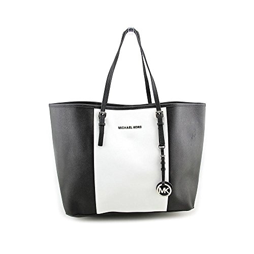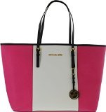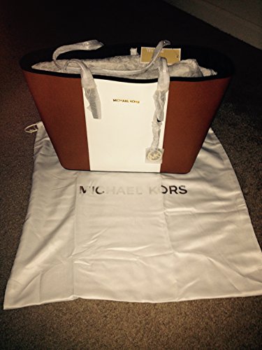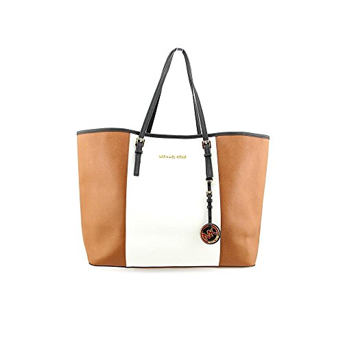 Contrast stripes bring a chic finish to this sturdy saffiano leather tote from Michael Kors. Gold-tone hardware adds shine, and slim strap handles carry over the spring-lock top line. A pouch pocket and zip compartment trim the interior. Dust bag included.Feature