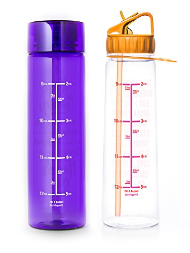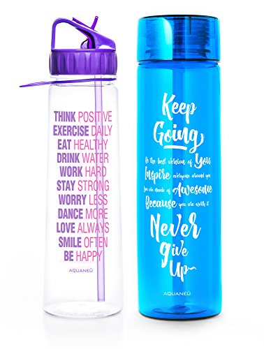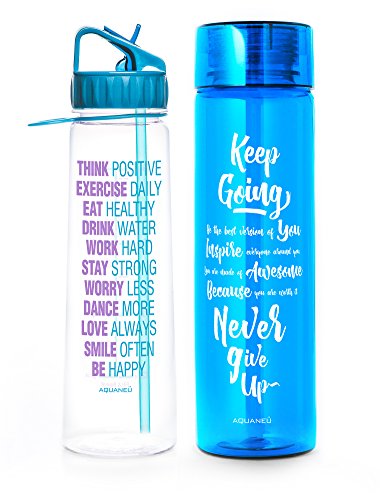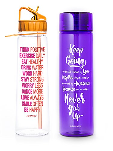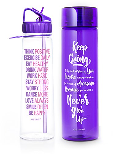Inspirational sayings inspire you all day. This Fitness Workout Sports Bottles is Great tool for everyday use. Use this bottle to go hiking, climbing, running, to the gym, or to work. This inspirational water bottle is BPA-free with Eastman Tritan Co-polyester material that is durable and safer to drink out of than standard plastic bottles, and it won't distort the tastes of your drink. This water bottle with quote is designed to motivate and keep you going, as well as a custom time marker to help you keep track of your water consumption. Conveniently fits in most cup holders so you can take it on the go. Water is the best way to stay healthy and lose weight. Our 30oz. and 32oz. keeps you refilling less and hydrating more. Durable Tritan material makes it last and label is heat printed to last through many adventures and is dishwasher safe. (Hand-washing is recommended. ) Simply fill the bottle once in the morning and once in the afternoon. If more water consumption is necessary, simple have a glass of water with dinner, any other meal, or anytime throughout the day. 100% SATISFACTION GUARANTEE. If for any reason our product doesn't meet your expectations, simply contact us and we will send you a full refund . We offer a Lifetime guarantee on the printed artwork and durability of the water bottle. Our 30oz. water bottle comes with carrying loop, detachable straw, and flip-top for easy drinking. The flip up straw lets you drink on the go and prevents spills. Fits in most large cup holders. Our 32oz. water bottle has a easy twist off cap and Wide-Mouth opening which makes it easy to fill and clean. Fits in most large cup holders.Feature
