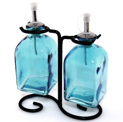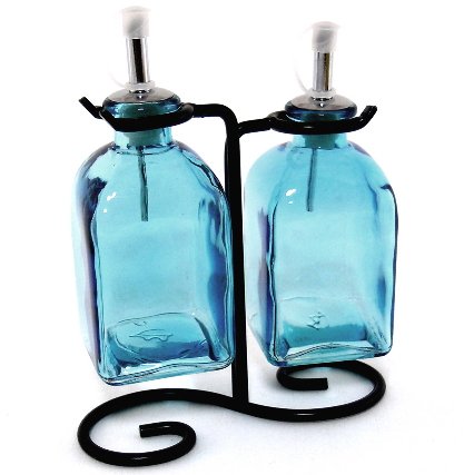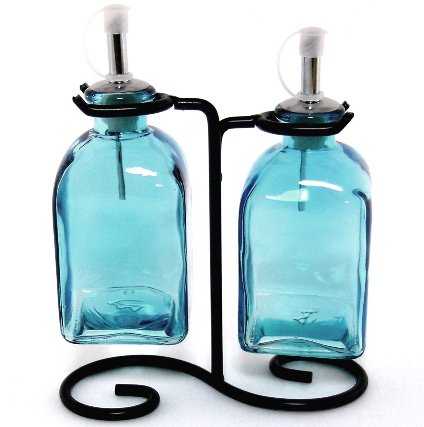 Country Vinegar & Olive Oil Bottle Set, Decorative Liquid Dispenser Set/2, G16 Aqua Glass Cruet, Drizzler Roman Bottles, with Swirl Stand