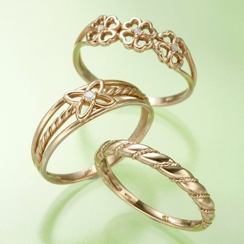 地金はピンクゴールド。アンティーク調なデザインが入っています。3本ライン+お花とひと粒のダイヤがキラリと輝く【シンプル】、3つのフラワーがお花畑のような【フラワー】、地金のみのデザインで重ねづけもできる【スクリュー】の3タイプをご用意しました。