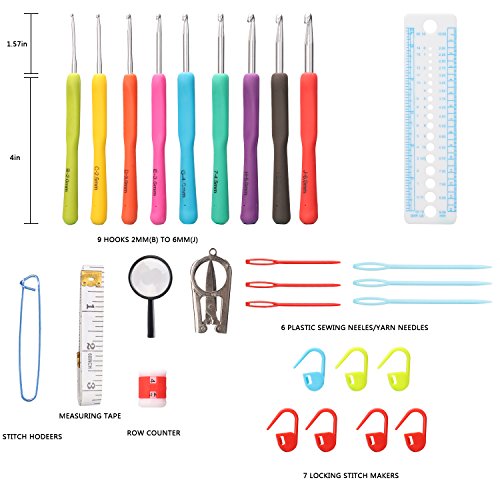 eSky24 Crochet Hook Set with 9 Ergonomic TPR Soft Handles B 2.0mm - L 6.0mm, 10 Stitch Markers, 6 Sewing/Yarn Needles, 2 Stitch Holders, Row Counter, Scissors, Measuring Tape&Gauge Measure Rule