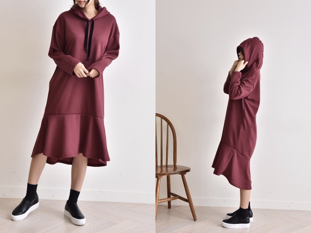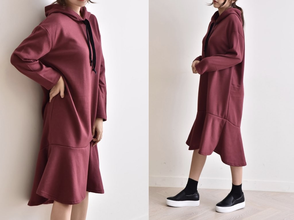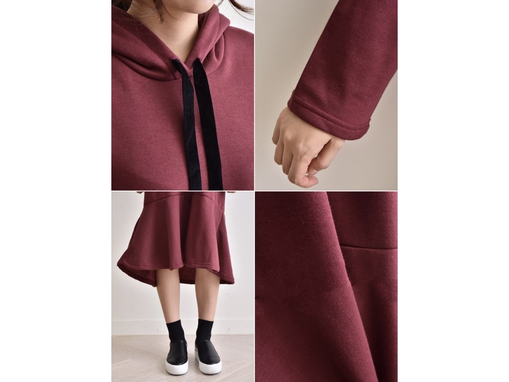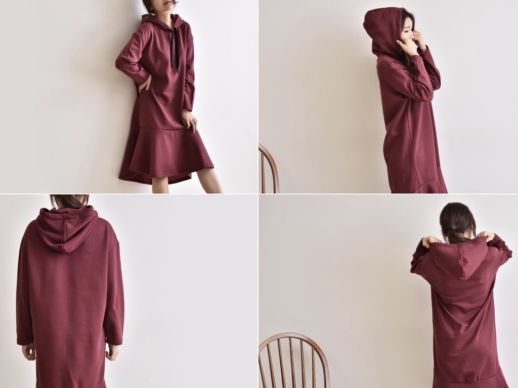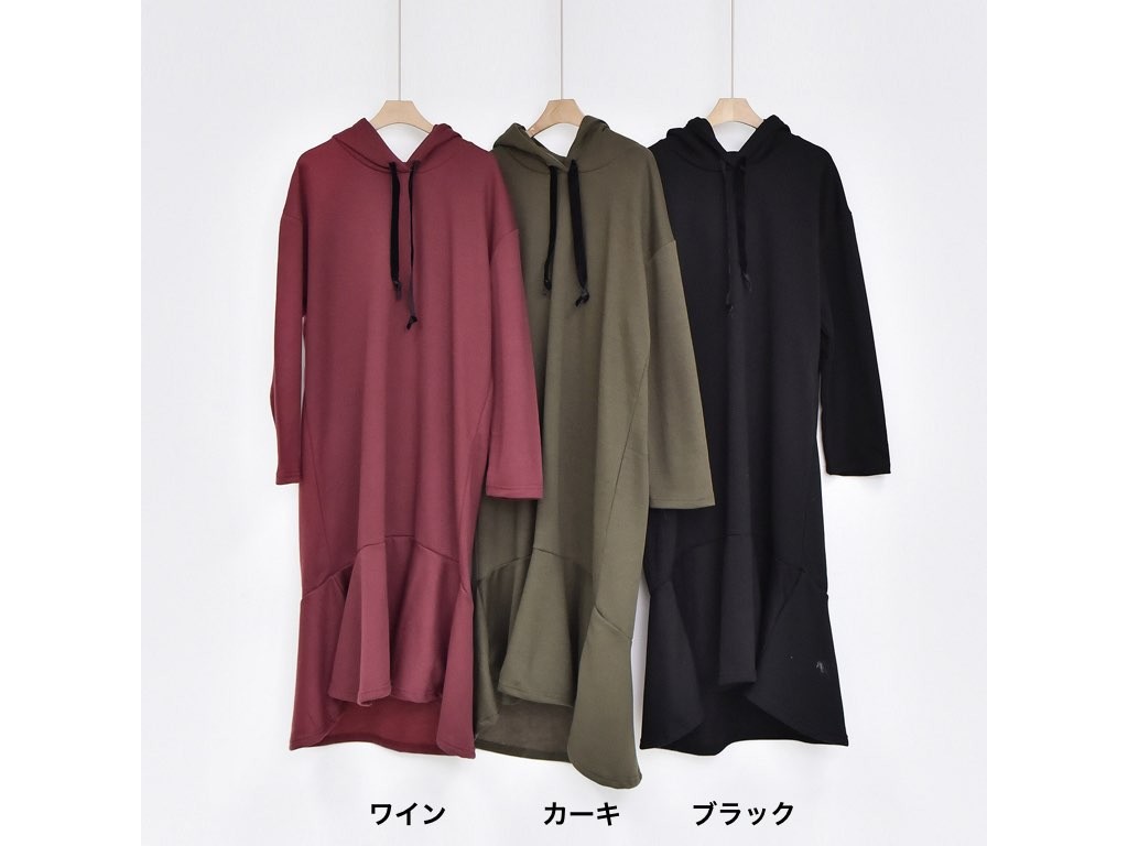 フードのついた「ふわっふわ」としたワンピースです。とても丁寧なつくりとなっており、ゆったりと着ることができます。1.基本情報色:3色展開(ブラック/カーキ/ワイン)サイズ:Free素材:綿混製造国:Korea2.サイズ情報肩幅:56cm 身幅(胸断面):54cm 腕の長さ:50cm 着丈:103cm (サイズは計る方法に応じて±2〜3cmの誤差があります。ご了承お願い致します)モデル着用サイズ:F※着用モデル(163cm、体重47kg、足のサイズ245mm)3.その他の情報厚み:中間透け感:なし伸縮性:中間裏地:有り(起毛)洗濯方法:洗濯お取り寄せ商品は、納品まで約10日前後いただきます。ご了承お願い致します。