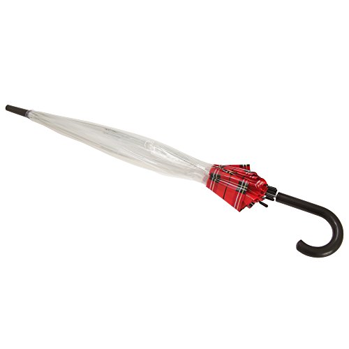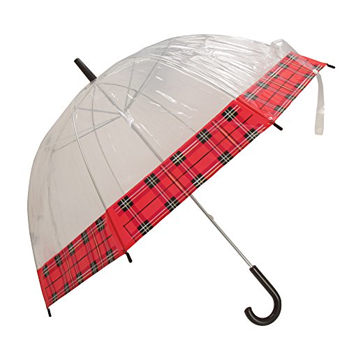 Product Description Ladies clear walking umbrella with tartan check border. Plastic handle and frame tips. Snap fastener to secure umbrella when not in use. Length: 31in, Diameter: 34.25in. 0