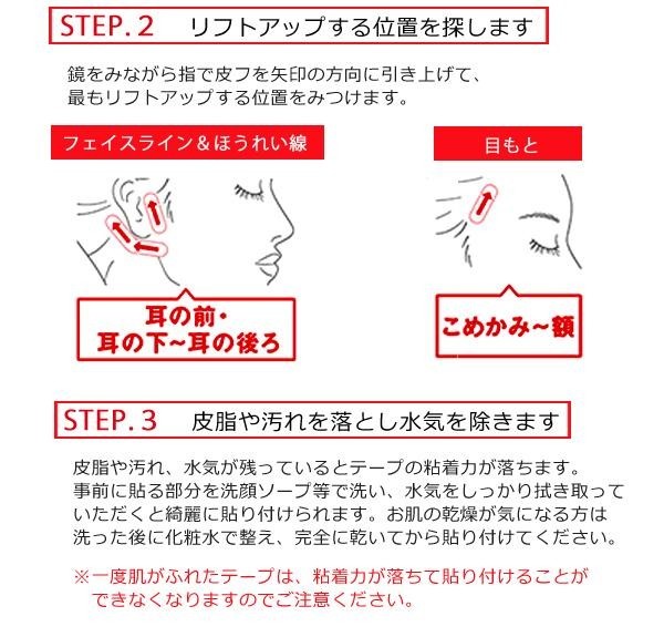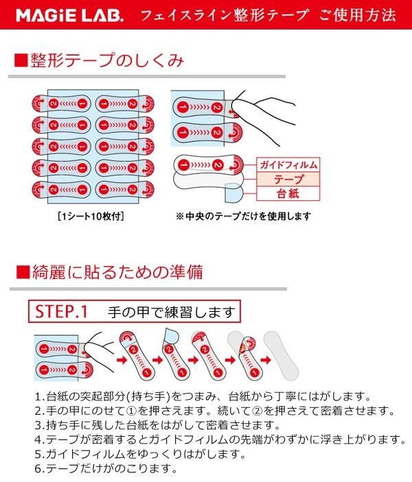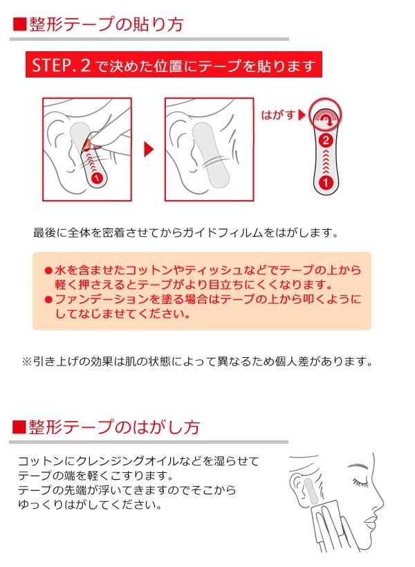 まるで皮フのような0.01mmの医療用極薄テープを使用。皮ふの動きにフィットするので違和感が少なく自然なつけ心地です。マットな透明素材で肌なじみが良く目立たず、上からメイクもできます。指で皮フをぐっと押し上げながらとめるだけで、一日中たるみ知らずの若々しいフェイスラインに。ガイドフィルムがついているので簡単に貼付けられます。こだわりの日本製です。 |