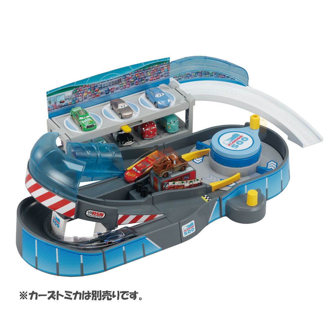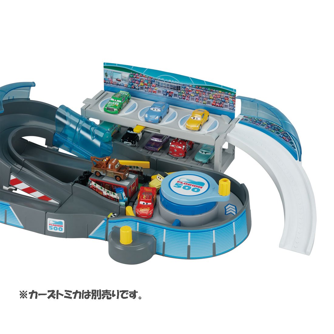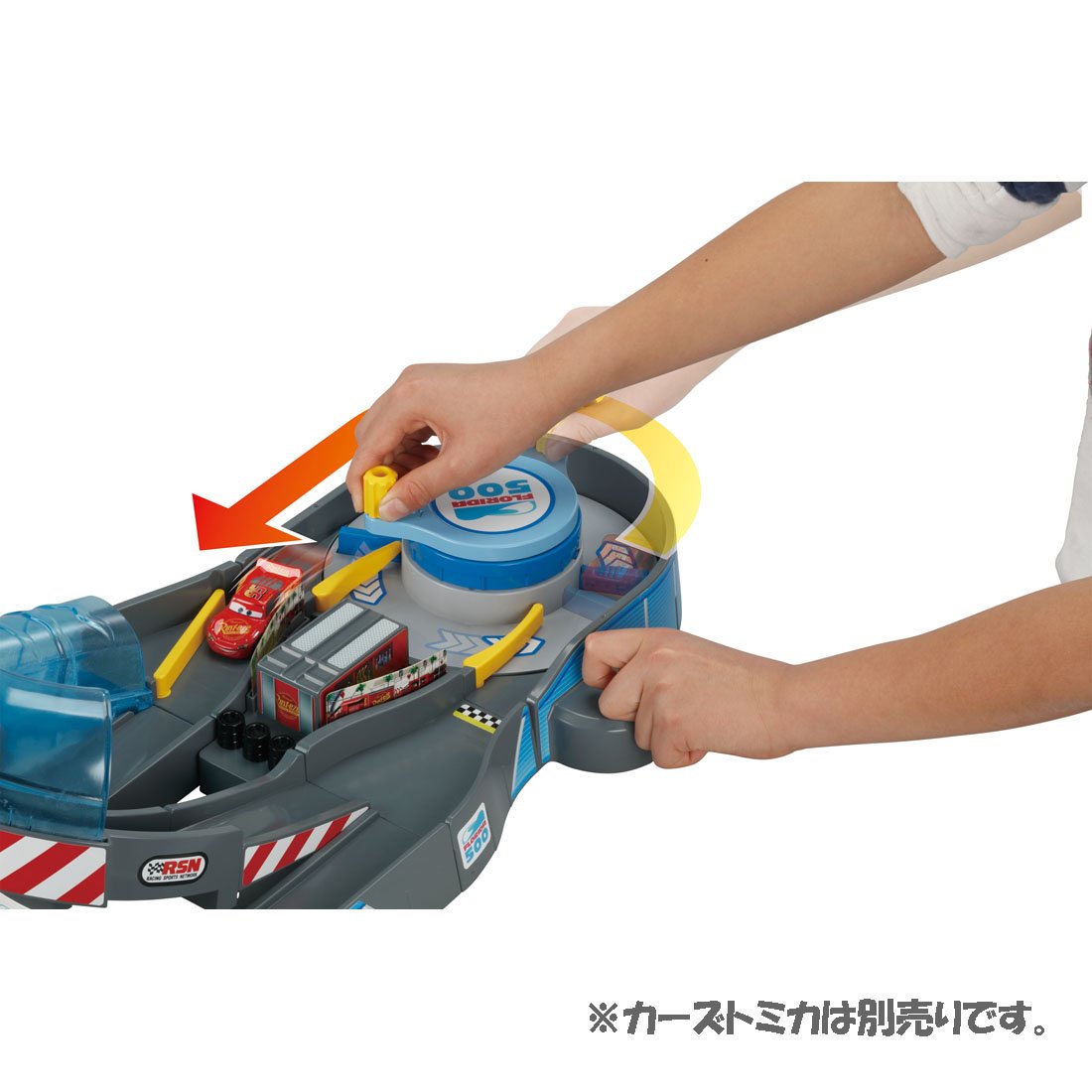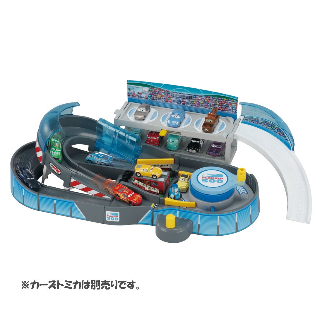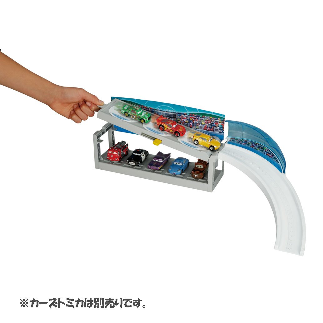 I am imagining the circuit appearing in "Cars 3", and I can start cars Tomica by turning the steering wheel in the center of the body!
