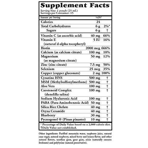 -. Feature : New single serving Nutripac pouch. No refrigeration required. Take anywhere single serving pouch. / Aloe Vera, Biotin, PABA, MSM, Phytoceramide Complex, Pycnogenol and Cynatine HNS / Vitamins including Vitamin C, Vitamin E plus Minerals Calcium, Magnesium, Zinc, Selenium and Copper / Hair Skin and Nails Plus for lustrous hair, vibrant skin and stronger nails / 15 - 25 ml single serving pouches