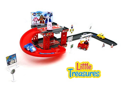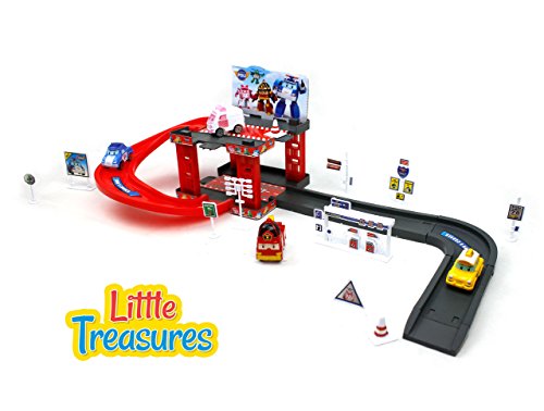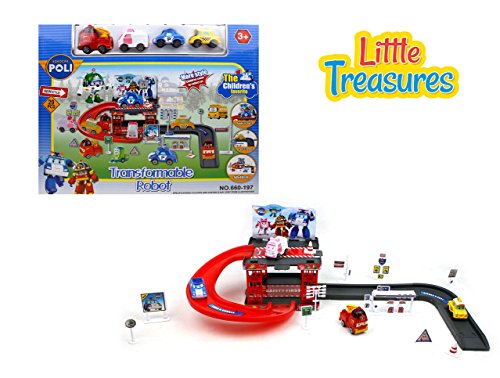 Kids favorite car garage with cars that transform in to robots - includes a bus, a ambulance, fire truck, taxi and a police car