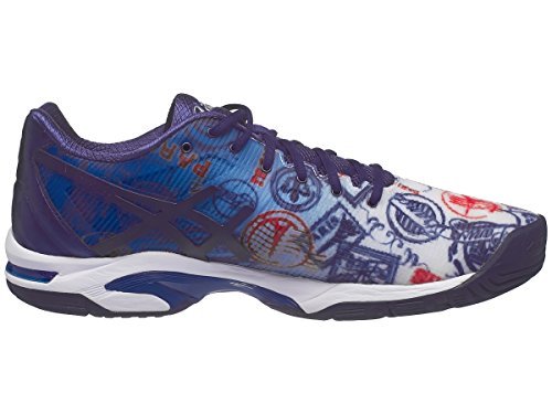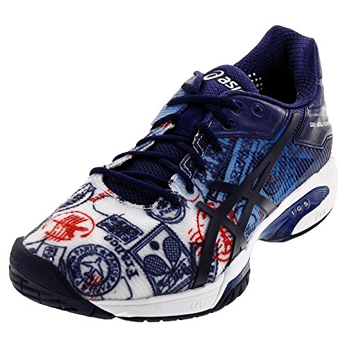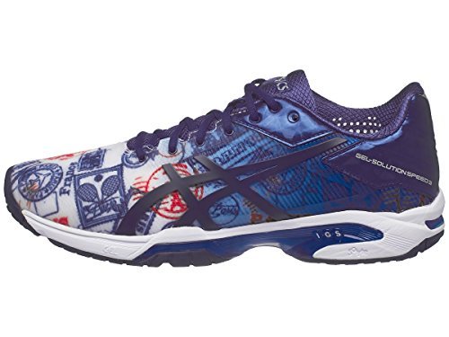 Binding : Apparel Product Description The new Limited Edition Asics Gel Solution 3 Men's Tennis shoe has a low profile sole with a new, lightweight, high-performance upper design. Graphics inspired by Paris offers a bold design, with all of the performance you know in the Solution Speed. This shoe is the perfect blend of moderate support and speedy ride with comfort and support for even the most aggressive, agile players. The Gel cushioning systems in the rearfoot and forefoot combined with the lightweight Solyte midsole offers excellent cushioning, while the FlexionFIT forefoot and Personal Heel fit system adds support and maximum comfort for competitive tennis players. Features: Upper: New High Performance Flexion Fit Upper-Provides form-fitting comfort without sacrificing support. PHF (Personal Heel Fit)-Memory foam lined heel collar molds to athletes heel, creating personalized fit. Midsole: Rearfoot and Forefoot GEL Cushioning Systems features a more flared lateral forefoot for added stability. Solyte 55 Midsole Material-Lighter than Asics' standard EVA and SpEVA, combined with improved cushioning and durability. Outsole: PGuard toe protection for added toe durability. 0