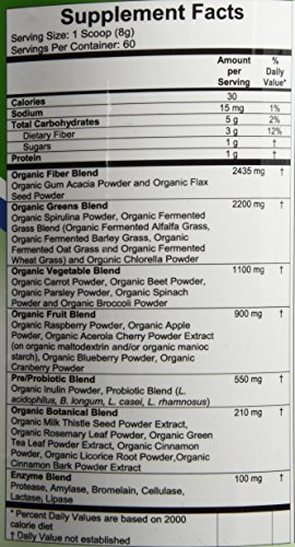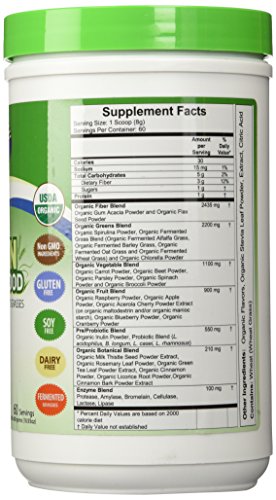 -. Feature : USDA organic. Non GMO ingredients. Gluten-free. Soy free / detoxification functions, immune system health, antioxidant defense, G.I. tract health alkaline forming, energy. 5 clean greens / 6 clean fruits. 5 clean vegetables. 6 clean enzymes. 5 pre/probiotics. One powerful super food.