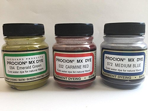 - Contains: Emerald Green, Carmine Red, and Medium Blue Fiber Reactive Dyes, Soda Ash, and Printed Instructions