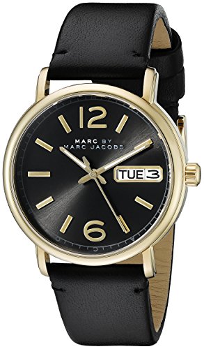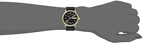 Gold-tone watch featuring black sunray dial with three-hand movement, logo, and date window at 3 o^^clock