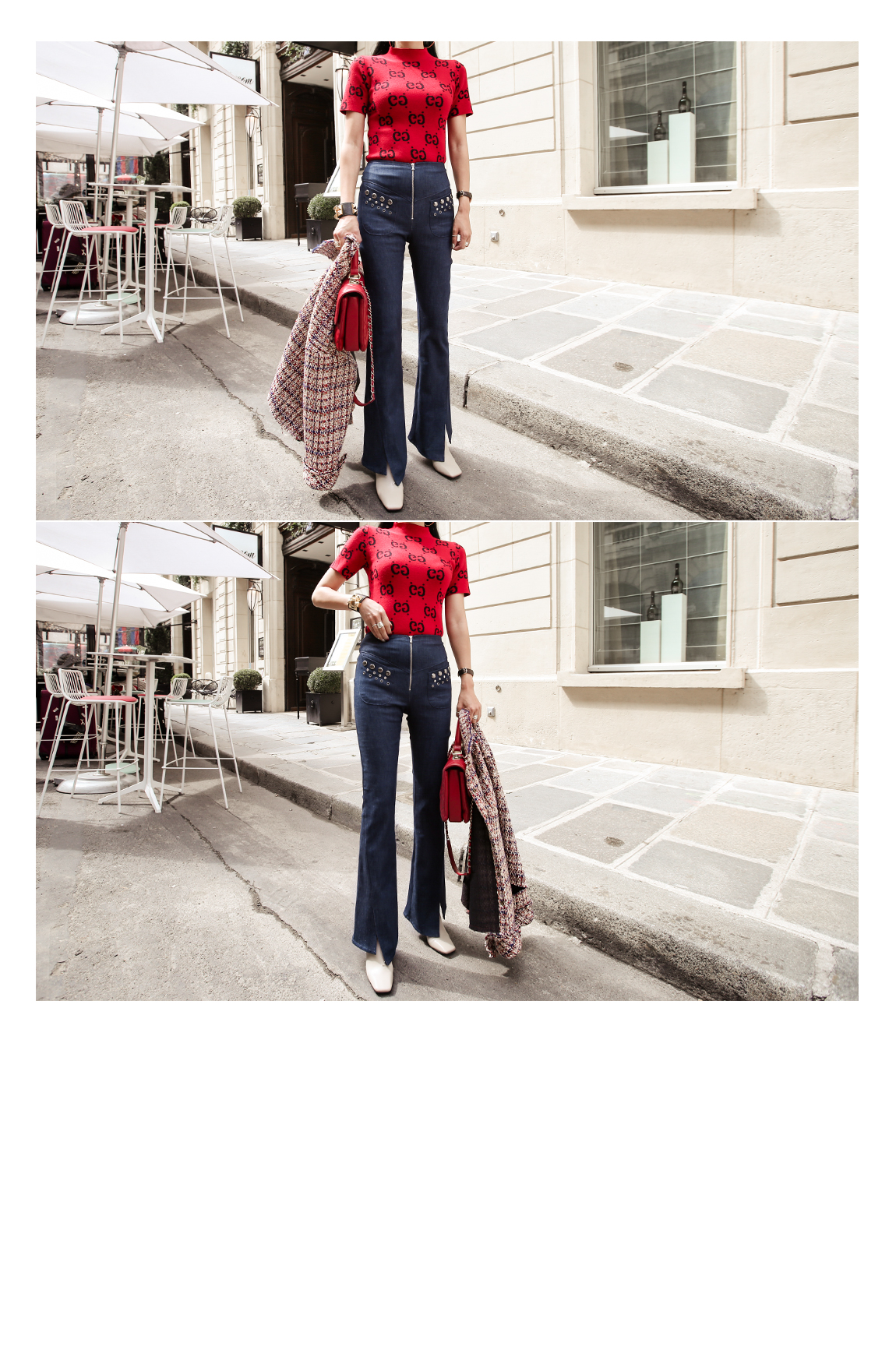 포켓의 스터드 디테일로 유니크한 포인트를 주었어요