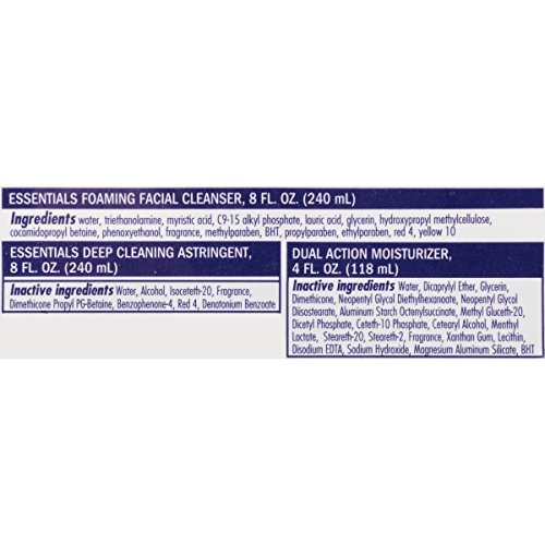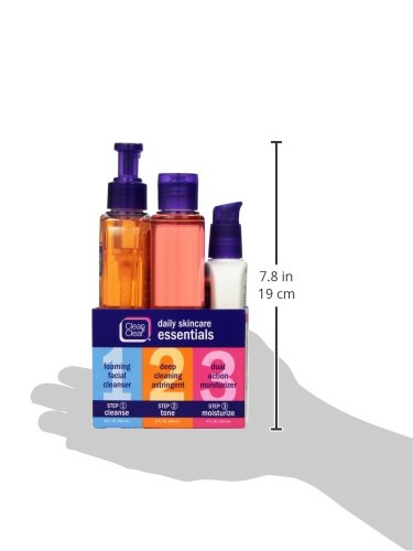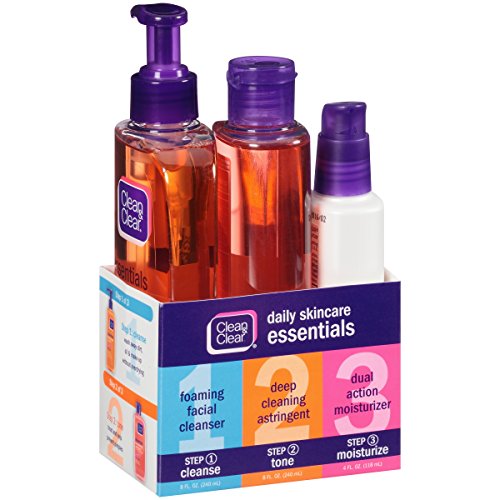 Use Clean & Clear Daily Skincare Essentials to get clean and beautiful skin. This daily skincare routine kit cleans your skin without over-drying it. Begin with the Clean & Clear Essentials Foaming Facial Acne Cleanser to cleanse your skin by washing away dirt, oil, and makeup. Next, use the Clean & Clear Essentials Deep Cleaning Astringent to tone, as this oil-fighting formula treats and helps prevent pimples. Finish with the Clean & Clear Dual Action Moisturizer to leave your skin soft.Feature