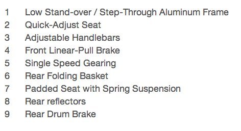 - Feature : Padded Seat with Spring Suspension / Rear Drum Brake / Rear Folding Basket / Adjustable Handlebars / Quick-Adjust Seat
