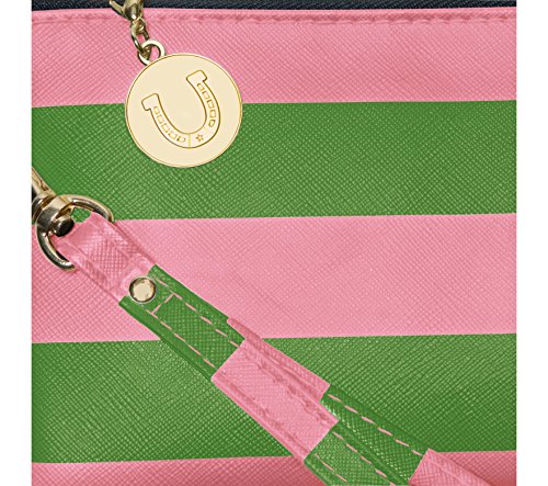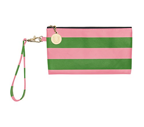 Product Description With this colorful and versatile pink and green striped wristlet, you can use as a clutch or remove the wrist strap and use as a makeup bag inside your favorite tote. Cute and clever, these pink and green stripes make the statement, while the charm provides the punctuation. 0