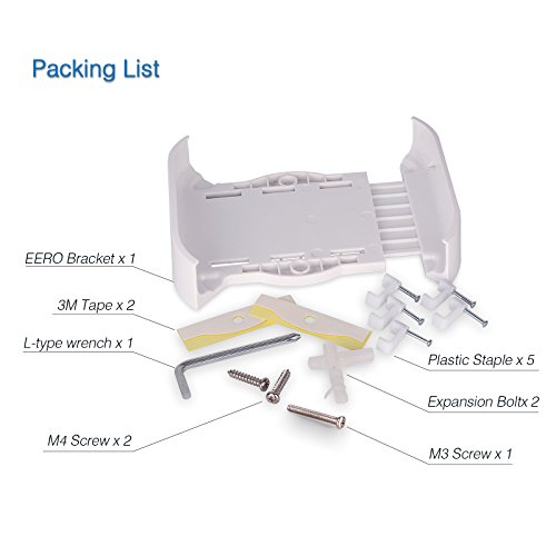 What you get: EERO Bracket*3, M3 Screw*3, M4 Screw*3, 3M Tape*6, L-Tape Wrench*3, Plastic Staple*15.