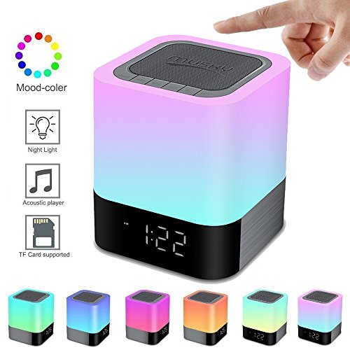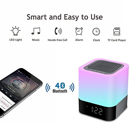 - 5 IN ONE SUPER MULTIFUNCTIONAL : Touch Sensor Night Light +Bluetooth 4.0 Hifi Speaker + Digital Alarm Clock + MP3 Player + Hands Free Call,compatible with all bluetooth devices. Support flash drive/micro SD Card input, AUX input. 3-Level brightness adjustable with the cool touch sensor design, warm led night light can create comfortable environment for you.