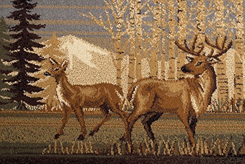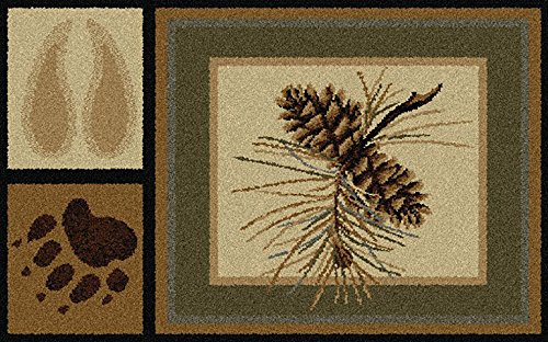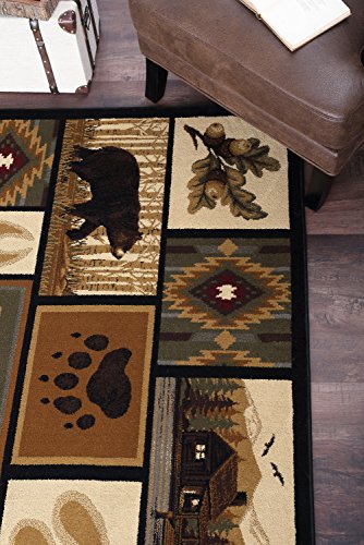 Inspired by nature, this area rug features bear, deer, a log cabin and leaves combined with elemental motifs. Beige, brown, green, blue, rust. Perfect for a lodge or cabin. Plush, easy-care polypropylene fibers; vacuum and spot clean.