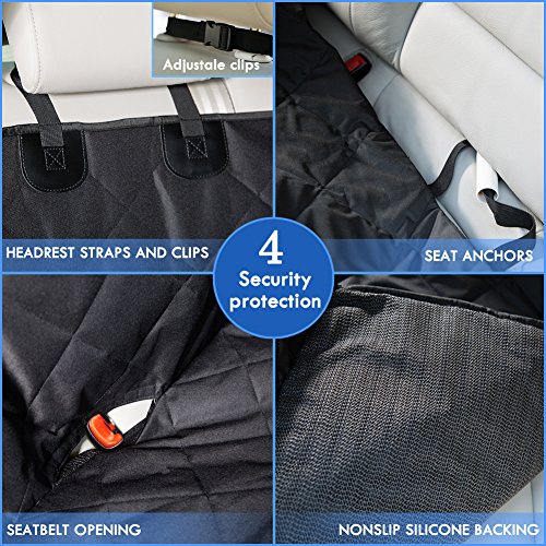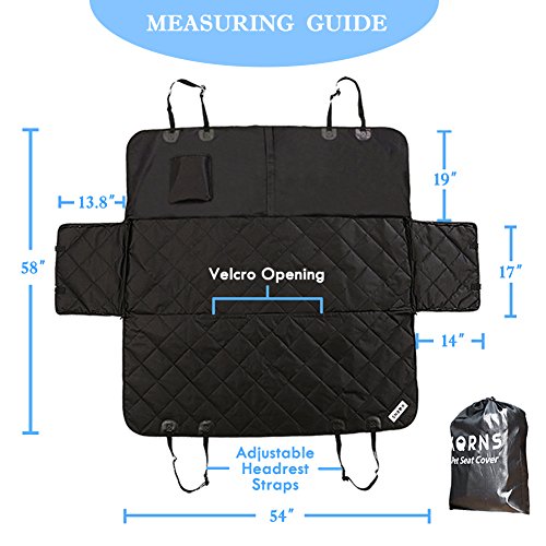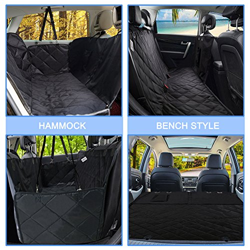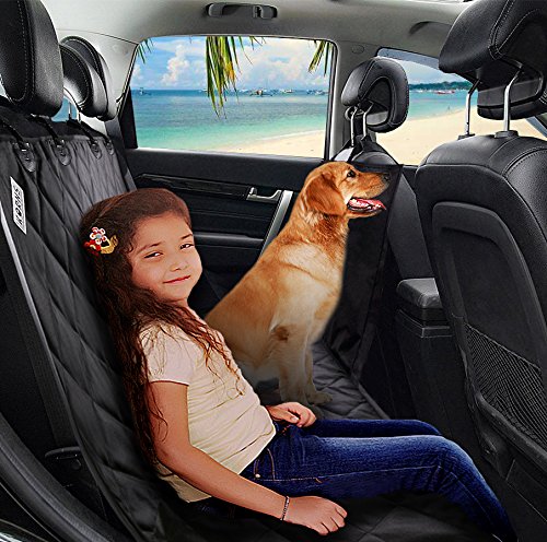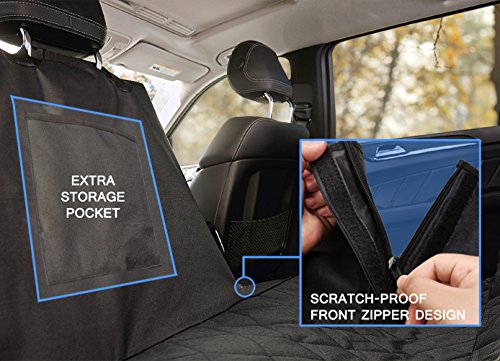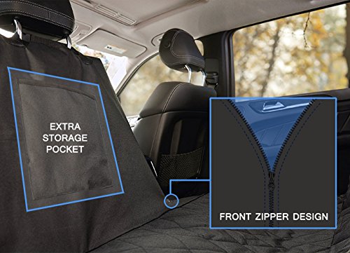 Top Features: Dog Seat Cover Hammock Style Unlike traditional dog car seat covers, hammocks hook onto the head rests of the back create a hammock for dogs in your car's back seat. This way not only provide a safe place for your dog to ride, but also protect your vehicle from dog hair, dirt, debris and damage done by canine's toenails. Front Zipper Design Designed with a convenient zipper in the front flap that allows dogs and your kids can share the back seat for traveling together. Extra Large Side Flaps Easy for large dogs to get in or out of car. Extra protection for door of car.
