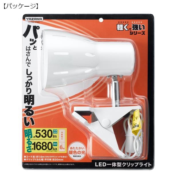 | 仕様 | 光源:電球色LED 消費電力:約6W 定格電圧:AC100V 定格入力:DC18V、0.26A 光源光束:約530lm 器具光束:約280lm 照度:約1680lux(30cm直下) 色温度:約3000K 設計寿命:約40000時間 クリップくわえ幅:平行時約30mm コード長:約1.6m(ON・OFFスイッチを含む) |