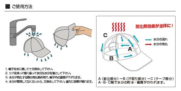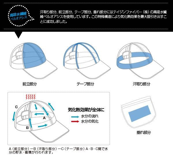 水分が循環して気化熱効果が全体に行き渡る画期的な特許取得済みの熱中対策帽子です。帽子の前立部分、汗取り部分、テープ部分を水分が循環するように設計されています。高吸水繊維ベルオアシスと速乾素材ダブルラッセルを使用し快適な着用感を実現しました。首筋を守る垂れは取り外し可能で使い勝手が広がります。 |