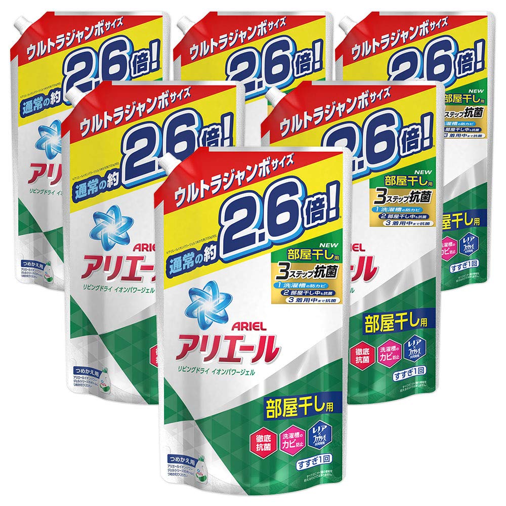 サイズ:1.90kg×6 徹底抗菌 洗濯槽のカビ防止 すべてのニオイ菌の増殖を抑えるわけではありません。 つめかえ用 すすぎ1回 洗濯科学のアリエール 部屋干し用 洗剤に抗菌力を求めるあなたに。 アリエールイオンパワージェルは 抗菌力にこだわった洗濯洗剤です。 アリエール独自処方で、3ステップ抗菌! 1 洗濯槽の防カビ 2 部屋干し中も抗菌 3 着用中まで抗菌 レノアxファブリーズ共同開発 強力消臭処方 消臭カプセル入り 液ダレ防止キャップ すべてのニオイ菌の増殖を抑えるわけではありません。 すすぎ1回OK 縦型洗濯機 ドラム式洗濯機 OK! サンシャインフレッシュの香り 洗濯洗剤