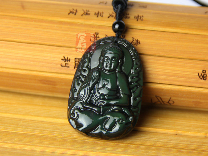 开光 天然彩虹眼黑曜石 阿弥陀佛菩萨生肖猪守护神本命佛吊坠
