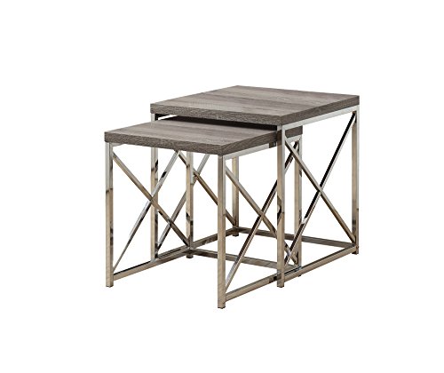 -. Brand : FurnitureMaxx -. Color : Brown -. EAN : 0759526736947 -. Feature : 2 piece set / Adds a modern chic look to any room / Chrome metal base for great support / Ample surface space / Small table: 16"LX16"DX17"H; Large table: 20"Lx20"Dx20"H -. Label : Furnituremaxx -. Manufacturer : Furnituremaxx -. Model : MON3255 -. MPN : MON3255 -. PackageQuantity : 2 -. PartNumber : MON3255 -. ProductGroup : Furniture -. ProductTypeName : HOME_FURNITURE_AND_DECOR -. Publisher : Furnituremaxx -. Studio : Furnituremaxx -. Title : DARK TAUPE WITH CHROME METAL NESTING TABLE, SET OF 2 -. UPC : 759526736947