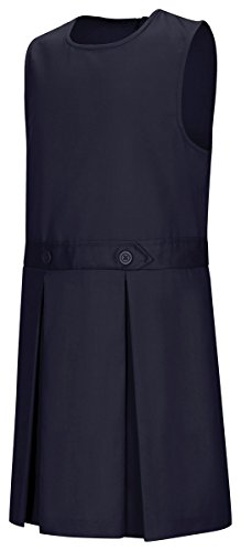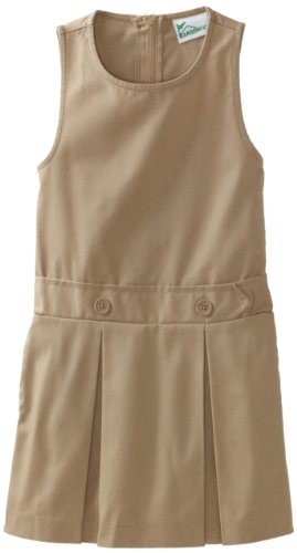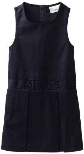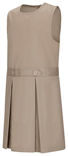 Traditional kick-pleat jumper has 4 pleats, button-tab waist accents, and back zip closure, poly/cotton twill for easy care