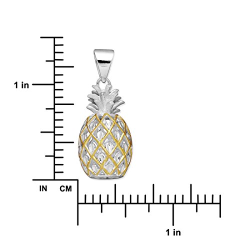 Large filigree three dimensional pineapple pendant. Body of pineapple is hollow. Sterling silver with 14kt yellow gold plated accents. Pendant measures 1 inch tall and 1/2 inch wide.