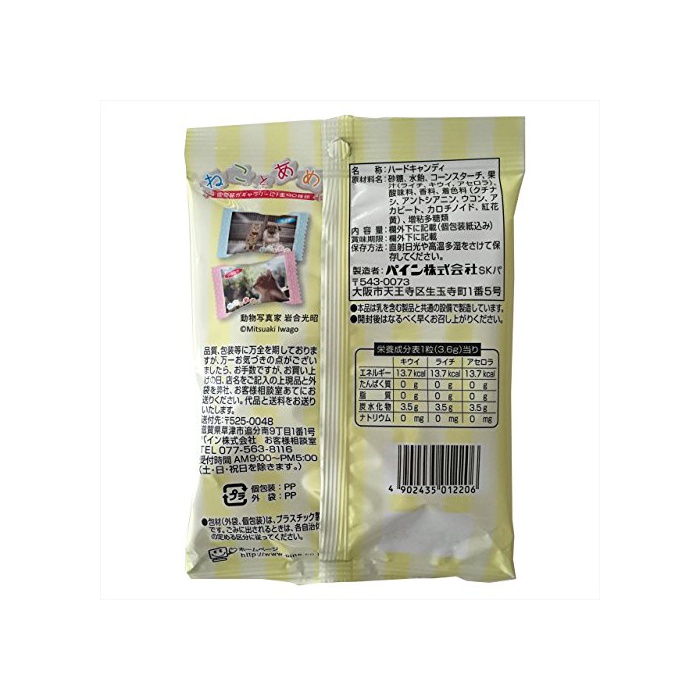 원재료:설탕,수 엿,콘 스타《지》,과즙(여지,키위,《아세로라》)고, 신맛료,향료,착색료(치자나무,앤《도시아닌》,《우콘》,《아카비토》,카로 치노 이 드,홍화 황)고, 증점다당류