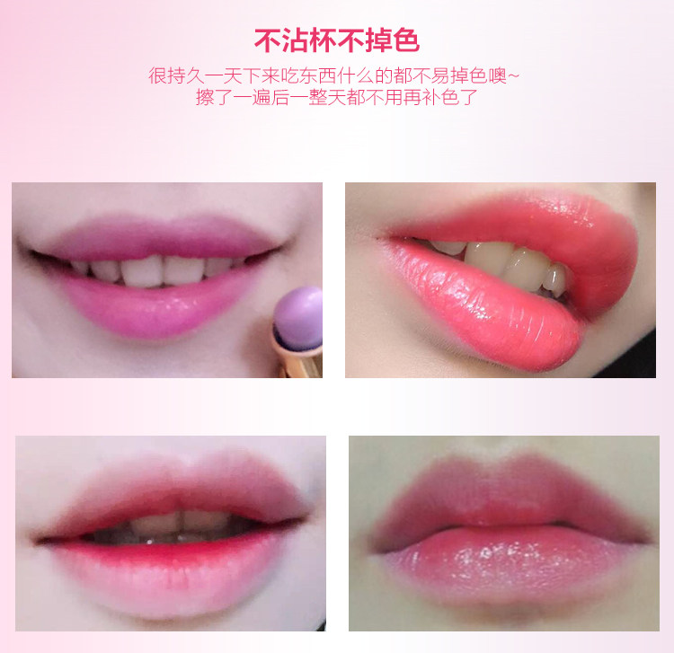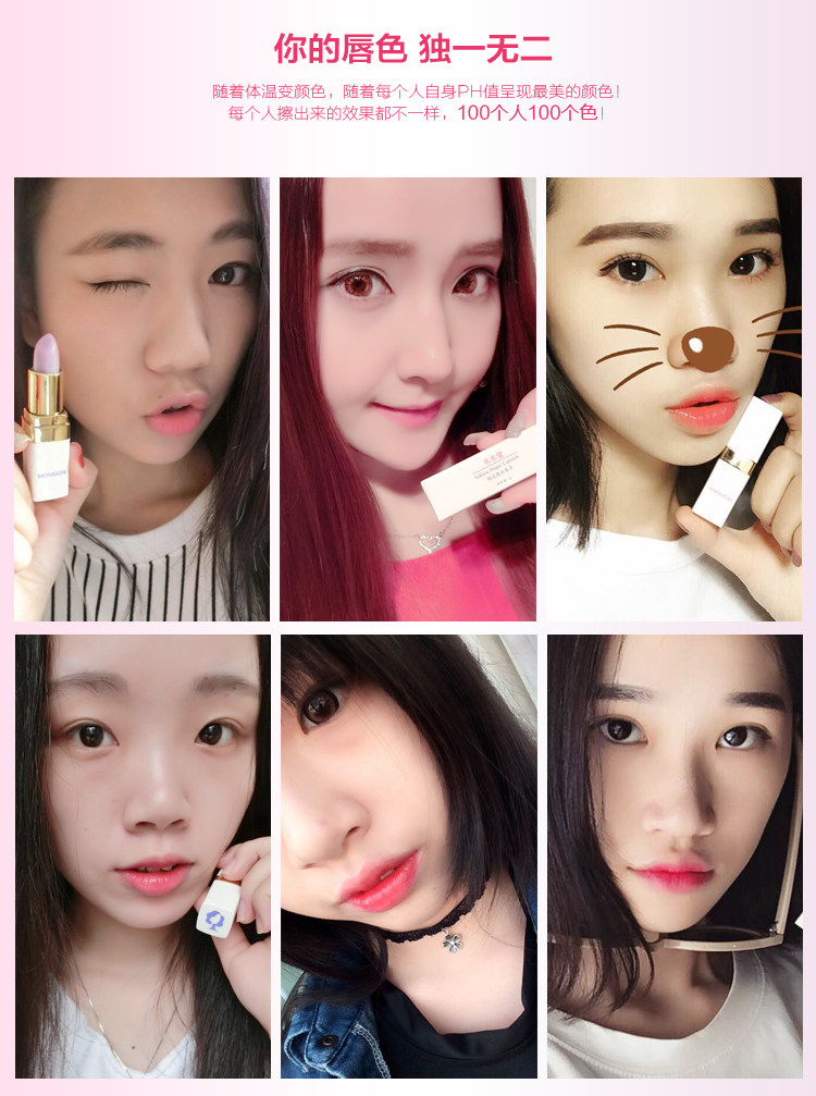 魔法变色唇膏啊莹为了让它更加持久不掉色,不浮色,不油腻,更加容易上色!特意和研究队研究了3个多月研究出最好唇膏,涂浅是浅粉红,浅橘红,涂深的珊瑚红,正红等等!而且之前膏体容易软,容易断,这款也改善了,膏体硬点不容易断。膏体做工更加精细漂亮而且光泽,旁边膏体于膏管留缝隙不会一直摩擦到所以延长了很大寿命。之前老膏体有顾客说太油了,这款就完全不会!升级的紫色膏体材料是最贵最贵的,不然为什么市面上没人用紫色膏体?就算几百块一支的变色唇膏也没人用这材料。木木莹家这是投资了大重本,招牌唇膏!