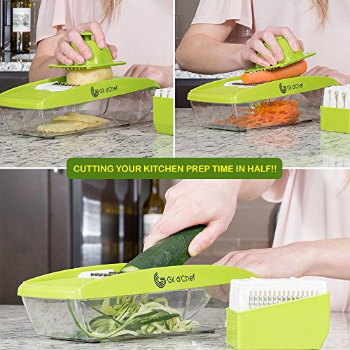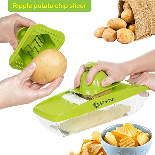 -. Title : Mandoline Slicer – Vegetable Slicer – Vegetable Cutter for Tomatoes, Cucumbers, Onions – Cheese & Potatoes Grater - Shredder with 5 Stainless Steel Blades, Catch Tray with Lid & Peeler by Gil d'Chef