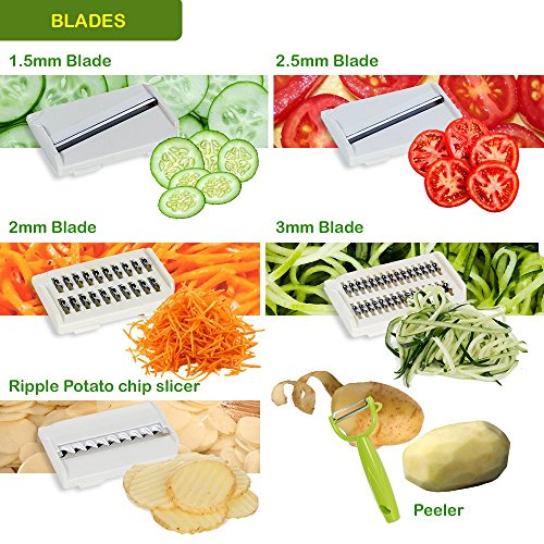-. Feature : ✅ 5 INTERCHANGEABLE BLADES let you create eye-catching julienne vegetables, fresh grated carrots and cheeses, ripple-cut homemade potato chips and more. Take the tedium out of meal prep with this essential home kitchen tool. / ✅ NO FUSS / NO MUSS with our self-contained slicer. With 2 julienne slicers, 2 straight slicers and 1 ripple slicer, you can put together a fresh, healthy salad right inside of the non-skid catch tray and then serve guests in minutes. / ✅ RAZOR-SHARP stainless steel blades slice through potatoes, carrots, cucumbers and blocks of cheese with ease. The 5 blades snap in and out in seconds, and their rust-proof design makes clean-up a breeze in your dishwasher. / ✅ SAFETY COMES FIRST so our slicer includes a comfortable, ergonomically molded hand guard / food holder to keep fingers out of the way of blades at all times. The catch tray and lid are made of non-toxic food-grade ABS plastic. / ✅ OUR PROMISE - It's not just about quality, it's about giving you the support you need when you need it. We know not everything goes according to plan, but rest assured, if you buy from us, you're covered. We offer a 30 day guarantee to ensure your satisfaction.