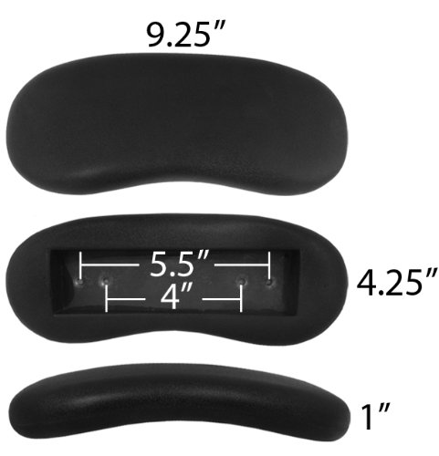 -. Binding : Kitchen -. Brand : chairpartsonline -. Color : Black -. EAN : 0122520145280 -. Feature : 4.25" Wide x 9.25" Long / 2 sets of mounting screw holes at 4" (100mm) wide & 5.5" (140mm) wide / 1/4-20 threaded mounting screw holes (hardware not included) / Cut-out area on underside of arm pad for mounting fixed or adjustable arms measures 6.5" long x 1.75" wide / Universal - Left or Right side (both are the same) - Sold as a PAIR - Set of 2 -. Label : chairpartsonline -. Manufacturer : chairpartsonline -. Model : S5280 -. MPN : S5280 -. PackageQuantity : 1 -. PartNumber : S5280 -. ProductGroup : Furniture -. ProductTypeName : HOME_FURNITURE_AND_DECOR -. Publisher : chairpartsonline -. Studio : chairpartsonline -. Title : Replacement Office Chair Armrest Arm Pads Kidney Shaped (Set of 2) S5280 -. UPC : 122520145280