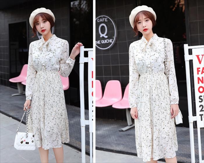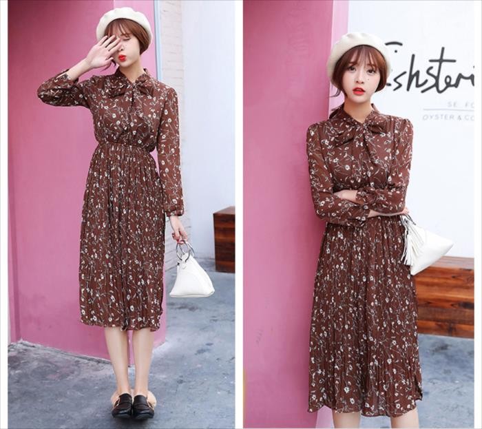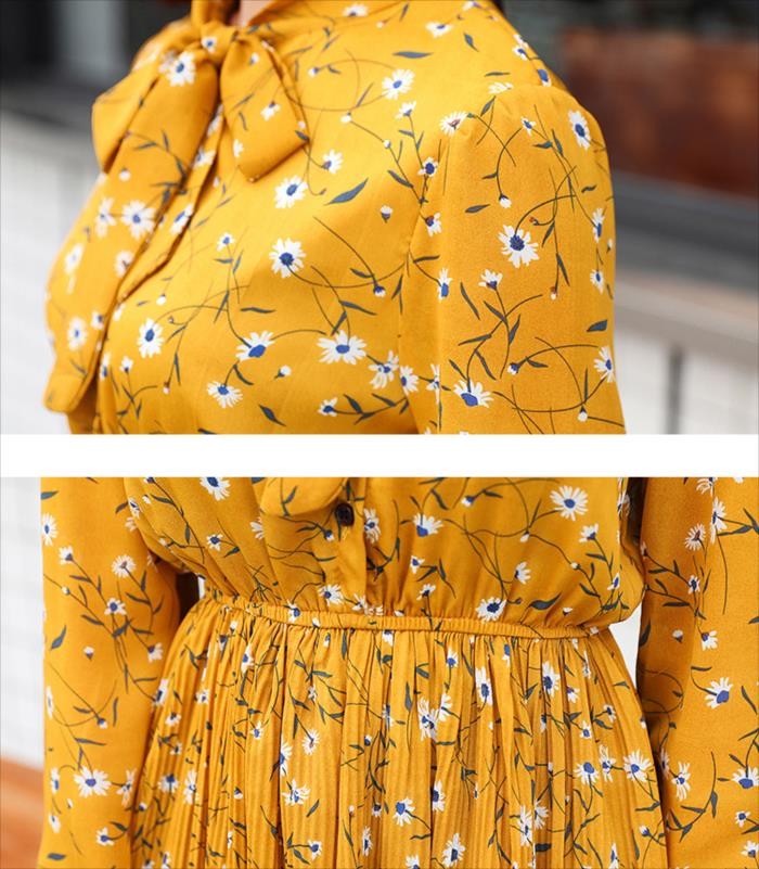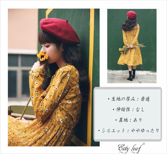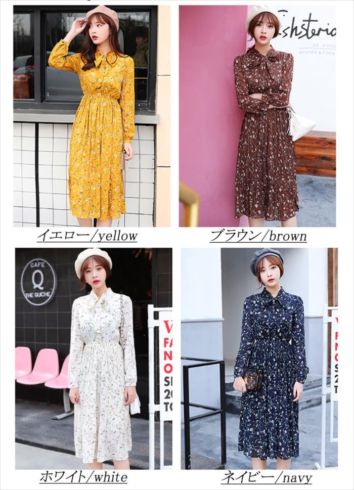 ●商品の特徴・女性らしいキュートな小花柄が全体に施された、シフォン素材のドッキングワンピース。・ウエストから下をエレガントなプリーツスカートに切り替えており、歩く度になびく、女性らしいエレガントな印象をプラス。・可愛くなり過ぎないクラシカルな花柄を施し、幅広い年齢層の方にご愛用頂ける、今年らしいレトロ可愛い印象を与えます。・首元は共生地のボウタイになっており、寂しくなりがちな首回りにガーリーでキュートな印象をプラス。●サイズ展開 【M】 着丈102cm バスト94cm 袖丈54cm 肩幅37cm 【L】 着丈103cm バスト98cm 袖丈55cm 肩幅38cm※平均での採寸となりますので、多少の誤差が生じる場合がございます。ご了承くださいませ。●カラー展開 ホワイト イエロー ブラウン ネイビー ※画像をご参照下さい。●商品詳細 【素材】:ポリエステル100% 【厚み】:普通 【裏地】:あり 【シルエット】:ゆったり 【伸縮性】:なし 【付属品】:なし (コーディネート使用の衣類、アクセサリー等は付属しません)20代 30代 40代 50代 人気 レディースファッション 大きいサイズ