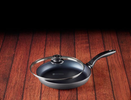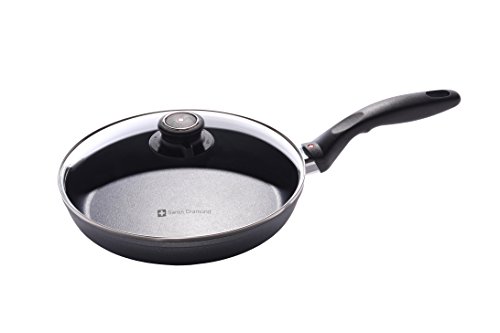 Arguably the most versatile piece of cookware available, a nonstick fry pan is a kitchen essential. The 24 cm (9.5") skillet from Swiss Diamond is a perfect wedding present or housewarming gift, as it's the perfect size for cooking for two. Brown a chicken breast like stainless steel on the patented nonstick coating, then use the fond to create a gravy - or simply wash with hot soapy water, no more scrubbing or soaking. Includes heat-tempered glass lid. The included tempered glass lid allows you to monitor food without lifting the cover, maintaining flavor and keeping food from drying out. The rotating lid knob opens or closes a steam vent to release or contain moisture as needed. Used by discerning home chefs around the world, Swiss Diamond's PFOA-free cookware features unsurpassed nonstick performance for healthy cooking and easy clean-up. The patented nonstick coating, reinforced with real diamond particles, allows oil-free cooking and cleans up with just warm soapy water. No more scrubbing and soaking. Swiss Diamond's patented nonstick coating is reinforced with real diamonds for excellent durability and resilience. Why diamonds? Three reasons: they are durable, they are naturally nonstick and they conduct heat better than any metal. A perfect combination for a lifetime of cooking excellence. Swiss quality is visible in every aspect of Swiss Diamond cookware. Heavy-duty cast aluminum will never warp, while the perfectly flat base distributes heat evenly and will not tip or spin. The rivet-free interior prevents unsightly food build-up that can lead to bacterial growth. The ergonomic handle, designed for comfort and balance, stays cool on the stovetop. All Swiss Diamond products are oven-safe up to 500 degrees F (260 degrees C). Induction model items, like this one, are suitable for all gas, electric and induction cooktops. Made in Switzerland with an eco-friendly production process.Feature